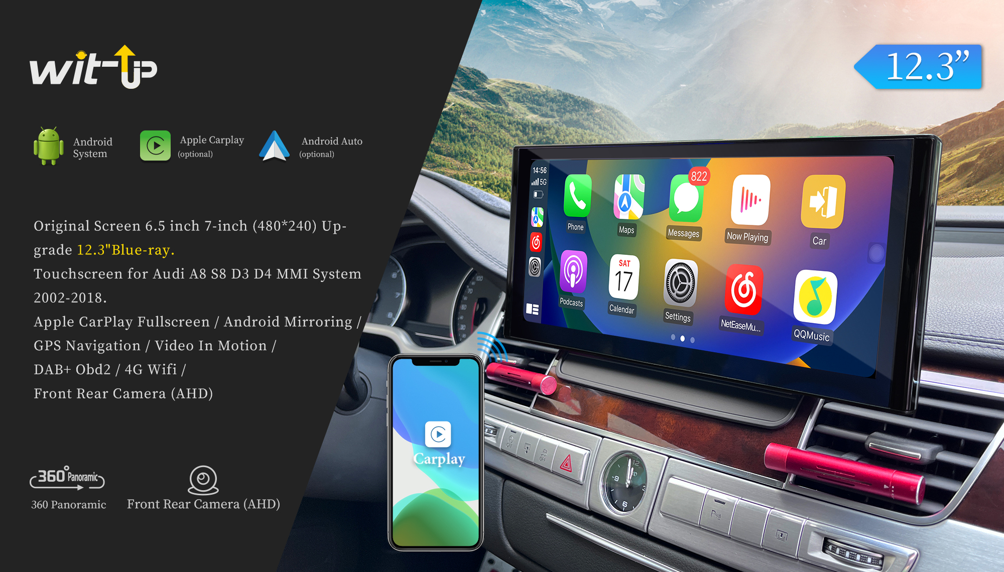 Wit-Up Audi A4 Stereo Car Radio Dash Kit Upgrade Head Unit 2004-2008 Radio Replacement 7 inch With Wireless Apple Carplay Aftermarket Camera Andio Auto Screen Mirror Bluetooth Music Video BT DVD Google Map