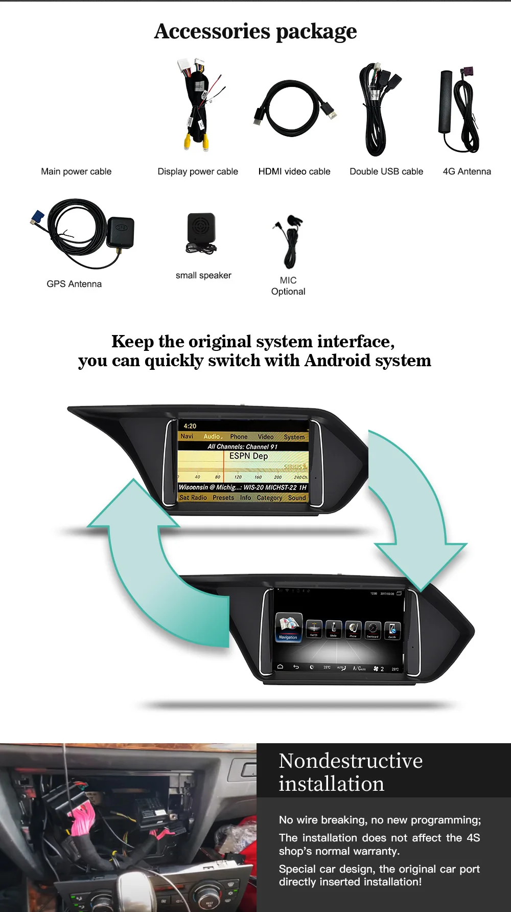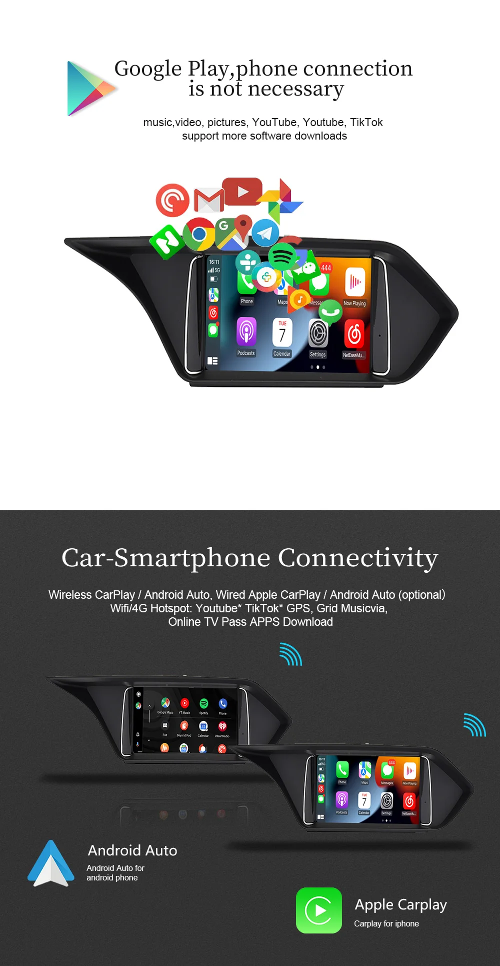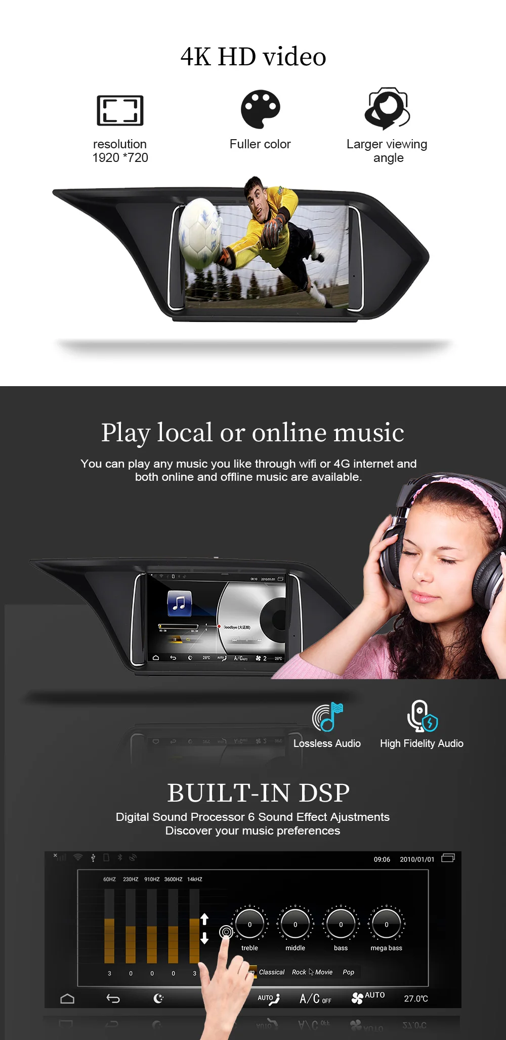 Android system in-car entertainment, used to control most secondary vehicle systems,assisted driving. Fit for BMW Audi Mercedes-Benz Porsche Land Rover/Jaguar Lexus Volvo volkswagenmore than 100 brands of cars. Allows the driver ( include front-seat passengers) to touch screen or knob to operate audio system (radio and CD player) , navigation system, and the communication system,the climate (air conditioner and heater), HD video (YouTube * TikTok *), online movies, Internet radio/TV, wireless CarPlay, has Android Auto, Bluetooth music, Bluetooth phone call, download various Android apps.